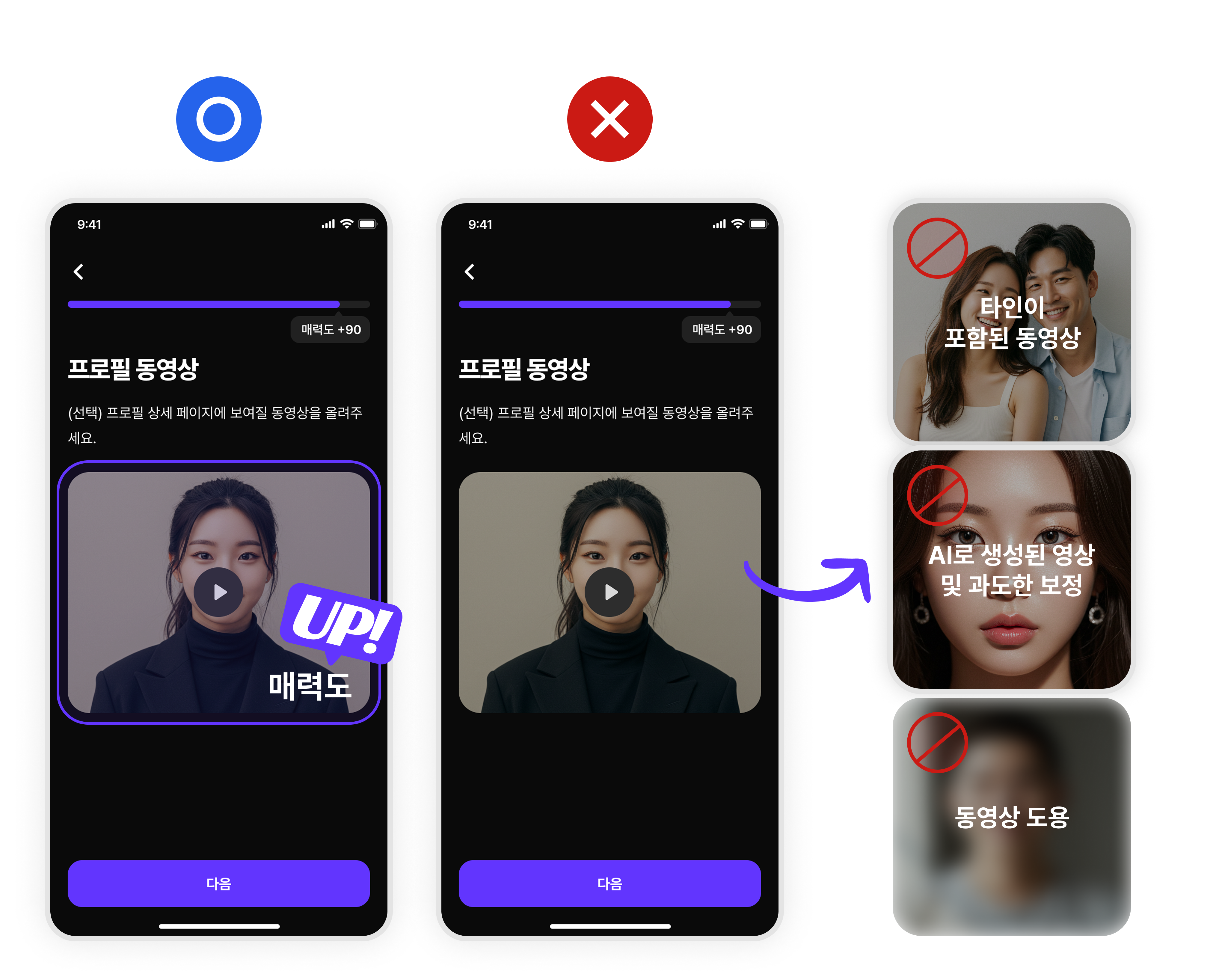 나의 프로필에 동영상을 등록할 수 있어요. 동영상은 나의 매력을 보여줄 수 있는 추가 수단 중 하나로, 반드시 등록해야 하는 건 아니에요. 하지만 사진만으로 보여줄 수 없는 나만의 매력을 추가로 보여주고 싶다면 동영상을 등록하시는 걸 추천드려요!