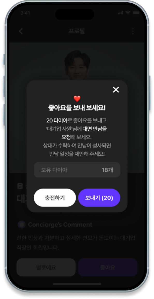 설명나에게 소개된 프로필에 대해 20 다이아를 사용해서 '좋아요'를 누르면 상대방에게 나의 프로필이 전달되고, 상대방도 만남을 수락할 경우 매칭이 최종 성사돼요.상대방에게 먼저 소개된 분이 있다면 한 분씩 순차적으로 소개되기 때문에 상대방에게 나의 프로필이 전달되기 까지는 시간이 소요될 수 있어요.